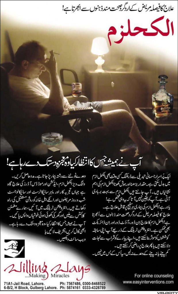 ایکپریس اخبار کا یہ اشتہار ملاحظہ فرمائیں اور دیکھیں کس طرح شراب نوشی کو الکحل ازم کے لفظ سے بدل کر ایلیٹ کلاس کو مخاطب کیا گیا ہے۔ اشتہار سے تو یہی لگتا