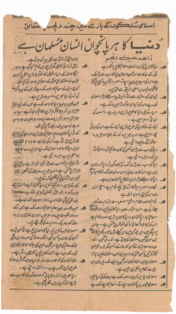 ہم نے جب اپنی اس ہفتے والی پوسٹ “دنیا کا ہر چوتھا انسان مسلمان مگر ناامید” دوبارہ پڑھی تو ہمیں خیال آیا کچھ اسی طرح کی خبر تیس سال قبل بھی چھپی تھی۔ جب اپنے پرانے کاغذات کو کھولا تو ہمیں اخبار کا وہ تراشہ مل گیا۔ اس تراشے میں مسلمانوں کے بہت سارے دوسرے ریکارڈ بھی درج ہیں۔ مگر جب ہم نے اس اخباری تراشے کو الٹا تو اس وقت بھی پاکستانیوں کی وہی حالت نظر آئی جو اب ہے۔ اس وقت بھی لڑائی جھگڑے عام تھے اب بھی ہیں۔ اس وقت بھی سیاسی پارٹیوں میں مفادپرست گھسے ہوئے تھے اب بھی ہیں۔ اس وقت بھی چینی کا بحران تھا اب بھی ہے۔ اس وقت بھی بس ڈرائیور لاپرواہ تھے اب بھی ہیں۔ چلیں آپ تراشے کے دونوں حصے دیکھیں اور خود سوچیں کہ ہمارے ترقی نہ کرنے کی کیا وجہ ہے۔