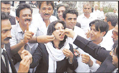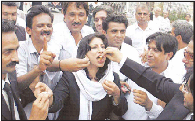 چیف جسٹس کی بحالی پر وکلا کے جشن منانے کا انداز دیکھیے جس میں وکلا اپنی ساتھی کو لڈو کھلانے کیلیے ایک دوسرے پر بازی لے جانے کی کوشش کررہے ہیں۔ایک وکیل تو باقاعدہ التجا کررہا ہے کہ مجھے بھی ایک لڈو دو تاکہ میں بھی لڑکی کو لڈو کھلانے کی سعادت حاصل کرسکوں۔ دو صاحب تو لڈو پکڑے بے صبری سے اپنی باری کا انتظار کررہے ہیں۔ چند بزرگ دور کھڑے پھٹی آنکھوں سے یہ نظارہ دیکھ کر خواہ مخواہ جل رہے ہیں۔ لڑکی بھی اس موقعے سے خوب فائدہ اٹھا رہی ہے ایک طرف اگر وہ لڈر منہ میں ڈلوا رہی ہے تو دوسری طرف ایک ہاتھ سےلڈو پکڑنے کی کوشش کررہی ہے۔ اس پر طرہ یہ کہ دوسرے ہاتھ میں لڈو پکڑا بھی ہوا ہے۔