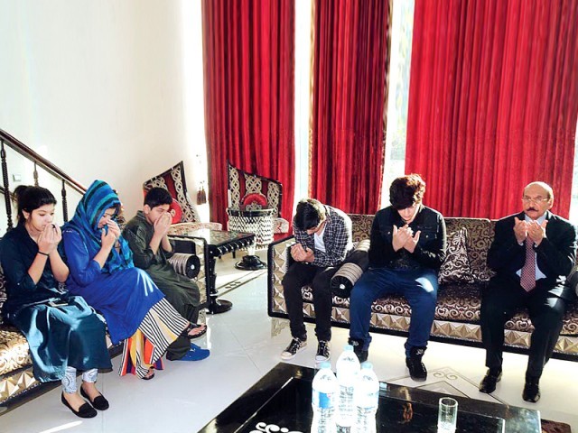 وزیراعلٰی سندھ قائم علی شاہ اس تصویر میں ایس ایس پی چوہدری اسلم مرحوم کے خاندان کو دو کروڑ کا چیک پیش کرنے کے بعد تعزیت کر رہے ہیں۔ لگتا نہیں کہ یہ خاندان وہی ہے جس کا سربراہ چند روز قبل قتل ہوا ہے۔ چوہدری اسلم کی بیوہ نے حکومت سے جو مطالبات کیے ان میں ایک یہ بھی تھا کہ ان کے بیٹوں کو بیرون ملک پڑھائی کیلیے بھیجا جائے۔