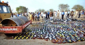 اسلام میں شراب پینا اور شراب کا کاروبار کرنا حرام ہے یہی وجہ ہے کہ موجودہ تصویر میں پولیس چھاپوں میں پکڑی گئی شراب کی بوتلیں بلڈوزر سے تلف کی جا رہی ہیں۔ اس کاروائی کو اگر موجودہ حالات کے تناظر میں دیکھا جائے تو کئی سوالات ذہن میں اٹھتے ہیں۔ اگر شراپ کا کاروبار اسلام میں حرام ہے تو پھر غیرمسلموں کے نام پر پورے پاکستان میں شراب کا کاروبار مسلمان کیوں کرتے ہیں؟ شراب بڑے بڑے فائیو سٹار ہوٹلوں میں کیوں فروخت ہوتی ہے؟ شراب کی دکانیں ملک کے بڑے بڑے شہروں میں کیوں کھلی ہوئی ہیں؟ اگر یہ سب جائز ہے تو پھر سمگل شدہ شراب کی بوتلوں کو تلف کرنے کی کیا ضرورت تھی۔ اس
