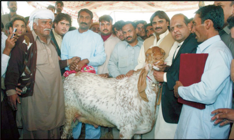 اس تصویر کے بکرے نے سب سے صحت مند ہونے کا انعام حاصل کیا ہے۔ اس کا وزن ساڑھے پانچ من ہے۔ اس کے مالک کو ایک لاکھ روپے انعام دیا گیا۔