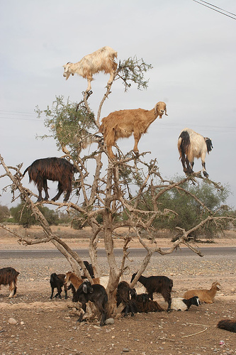 اس تصویر میں دیکھیں بکرے کی مائیں قربانی سے بچنے کیلیے درخت پر چڑھ ہوئی ہیں۔ شاید انہوں نے شیر کی خالہ والی کہانی سن رکھی ہے اور ان کا خیال ہے کہ بلی کی طرح وہ بھی درخت پر چڑھ کر اپنی جان بچالیں گی۔ لیکن انہیں یہ معلوم نہیں ہے کہ ان کا واسطہ اس قوم سے پڑا ہے جو جانور تو کجا وہ اپنے بہن بھائیوں کی قربانی دینے سے بھی گریز نہیں کرتے۔ ان کے حکمران نے تو اب تک اپنی رعایا کو بیچ بیچ کر ڈالر کمانے کی داستانیں بڑے فخر سے اپنی کتابوں میں بیان کی ہیں۔